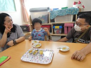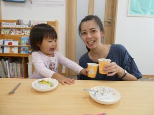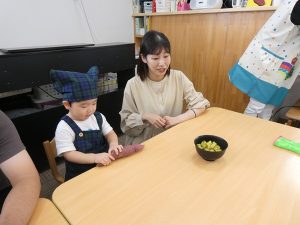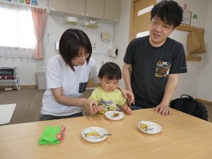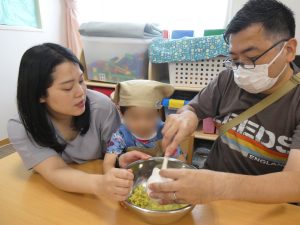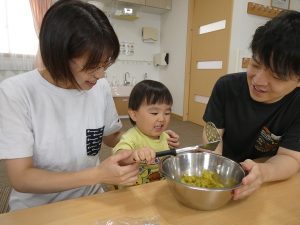 「おいしくなーれ!おいしくなーれ!」と、おまじないをかけながらお家の方と一緒に潰したり、「じぶんで!」と自分で