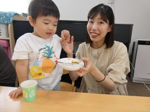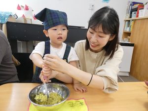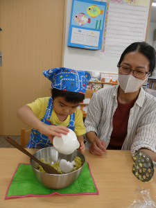 子ども達も材料が入っているカップを自分で持って入れるお手伝いをしたり、ヘラを一緒に持って混ぜ合わせたりと