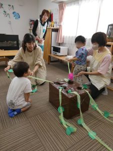 さんで新聞紙でお芋を作ったり、段ボールで作った畑からお芋を引っ張り芋堀りごっこを楽しんでいました。
