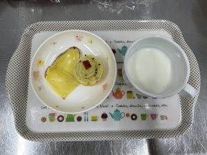 ハロウィンにはおばけかぼちゃのおにぎりやかぼちゃのポタージュ、おやつはさつまいもクリームのもんぶらんとおばけの顔のチップスなどいろいろなところにおばけを潜めた給食となりました。