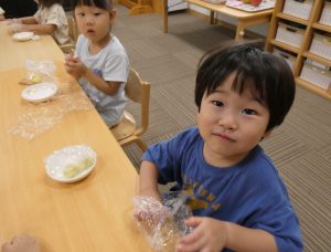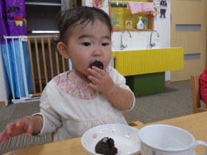 10月6日(月)は中秋の名月でした。お月見団子にちなんでふかしたさつまいもを丸め、きな粉をまぶしたお団子を作りました。