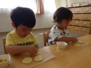 いちご組さんはとなりのお友達の様子を伺いながら上手に作ることができました。