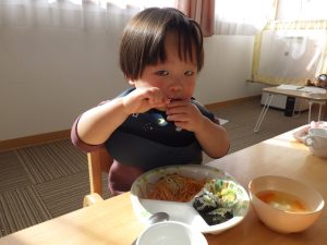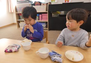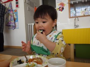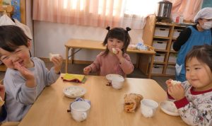 鬼さんの形をしたハンバーグは、豆まきで「鬼さんは怖い」と思ったいちご組さん。恐る恐る食べ進めます(笑)しっかりやっつけてくれました^^恵方巻は海苔を細かく刻んで、子どもたちが安全に食べやすいように工夫してあります。