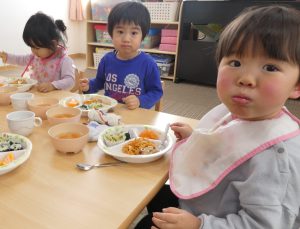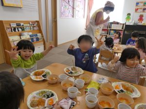 給食を見た子どもたちは「鬼さんやっつけたよ!!」と豆まきの様子を教えてくれました♪
