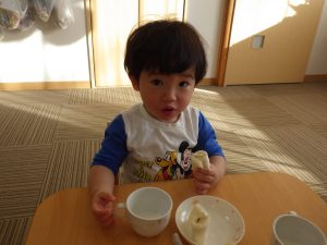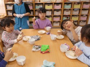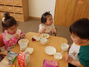 みんなとっても静かです(笑)いつもは使用しない生クリーム。もちろんおかわりまで完食です^^満了児さんにとっては残り少ない園生活です。少しでも心に残る食の体験ができるよう来月も給食を提供していきます。