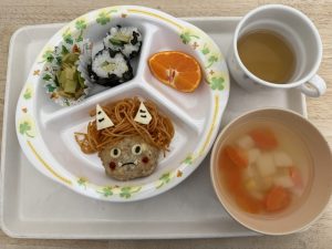 2月3日は節分の行事食メニューで鬼さんバーグ、恵方巻、大豆サラダ、野菜スープです。