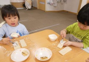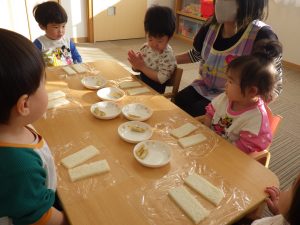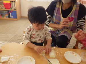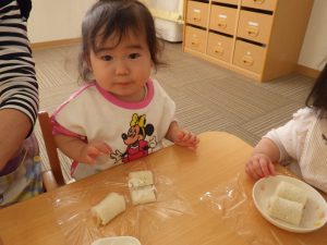 材料を配って説明すると、みんな真剣に作り始めます。離乳食の子は、きな粉ロールにして一緒に食育を体験します。いちご組さんも上手に巻けました⭐