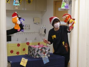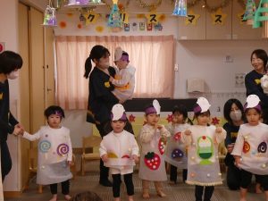 サンタさんを前に緊張していましたが、ばけたくんになったり、自分の名前を言ったり、ダンスや合奏を