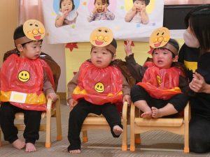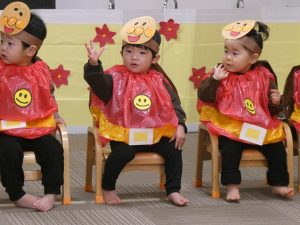 発表の後は保育士からのプレゼント…パペットシアターのはじまりはじまり!アンパンマン、バイキンマン、ドキンちゃんの登場に子ども達もお家の方も大喜び。アンパンマンからお菓子のプレゼントをもらうとニッコリ笑顔の子ども達。その姿を見てお父さん、お母さんもニコニコ!!”ほっこり”