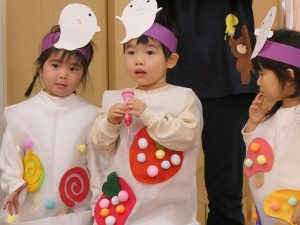 おばけが大好きな子ども達。好きな食べ物に変身するばけたくんになりきり楽しみました。