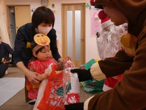 その後は一人ずつ名前を呼んでもらい、サンタさんからプレゼントとお菓子が入ったブーツをもらいました。もも組のお友だちは「ありがとう」とサンタさんにお礼を言い、プレゼントを見ながらワクワク!ドキドキ!嬉しかったね!