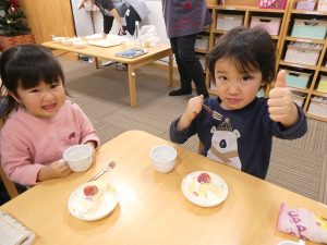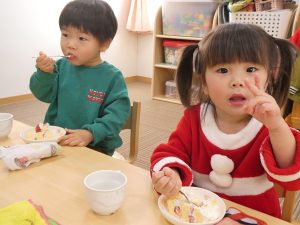 「おいしい!」「いちごもたべたよ!」とサンタさんからのケーキを嬉しそうに食べ、ニッコリ笑顔に!